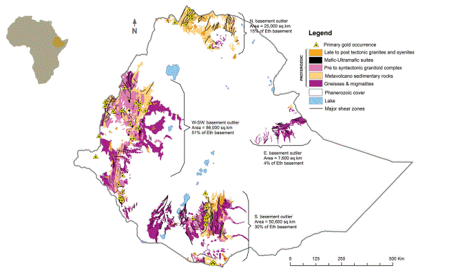 Gold is one of the major minerals Ethiopia has been producing followed by tantalum, potash, gemstones (opal, emerald), platinum, and industrial minerals like limestone and soda ash. Ethiopia’s gold deposits are clustered in a Proterozoic basement, which covers about 18% of the country. Tigray, Benishangul-Gumuz, Oromia, and Gambella are the major gold deposit regions in Ethiopia.
